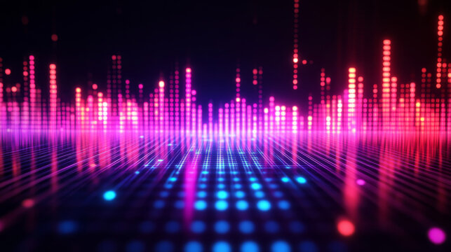 Glowing waveform over rotating cubes on abstract digital canvas