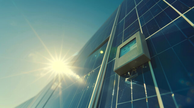 The intense heat and light of the sun radiate onto a of solar panels dark rectangular shapes contrasting against the bright blue sky. A small meter attached to the panel