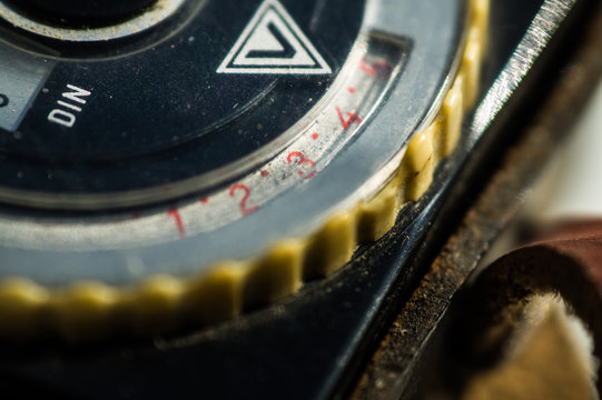 Older Man in Blue Denim Shirt Holding Light Meter to Face