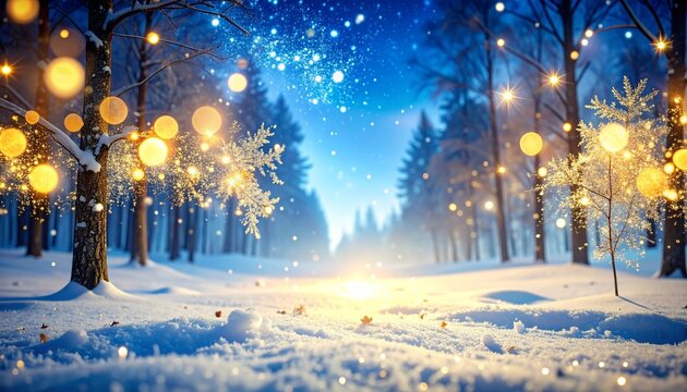 Snow-covered forest illuminated by golden light orbs with misty pine trees and serene winter atmosphere