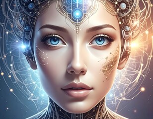 Ethereal woman cradling glowing orb, luminous filaments and gauze veil, mystical serenity