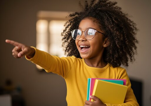 An adorable girl points with excitement, clutching books with glee in preparation for school.