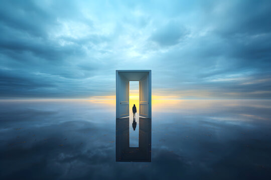 silhouette of a man in a doorway in nature. the concept of going through a portal to another world. fantasy of transformation of another dimension of the universe