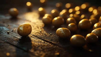 Close-up of numerous small, golden potatoes on a rustic wooden surface, bathed in warm light