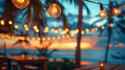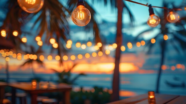 Blurred background of an outdoor cafe with string lights at sunset on the beach, blurred palm trees and ocean in bokeh. Vintage light bulbs for a summer party or wedding ceremony decor.