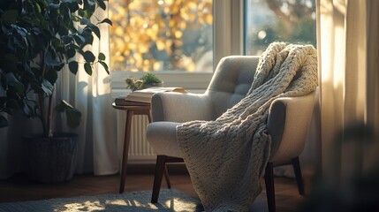 Cozy Autumn Morning: Sunlight Streaming Through Window onto Armchair with Knit Blanket