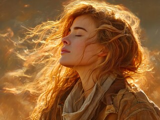 Redhead woman closes her eyes in meditation with golden sunlight streaming through her flowing hair outdoors.