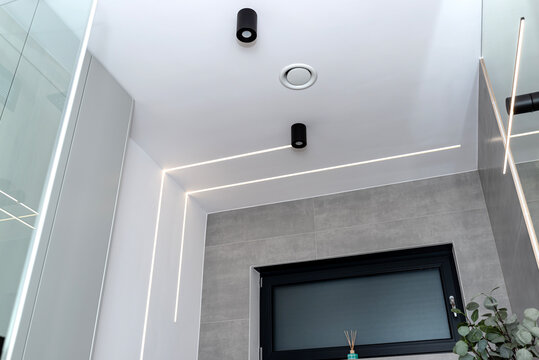 Building lobby with recessed LED light strips on walls and ceilings, showcasing a clean and modern design