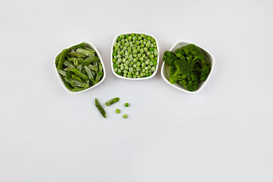 A mix of  frozen  green vegetables: broccoli, string beans and green peas in bowls on a light  grey background. Top view with copy space.