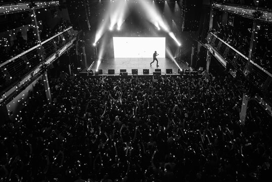 Breathtaking aerial perspective from an airplane window, capturing the dazzling city lights illuminating the night sky above a blanket of soft clouds during a serene flight journey