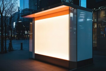 blank digital ad panel. billboard display. empty white lightbox sign at busstop. glass structure. mockup template panel. city transit station. urban street setting. outdoor advertising.
