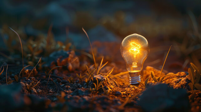 A lightbulb with a tree inside, in a forest at sunset. Symbol of nature, environmentalism and new ideas.