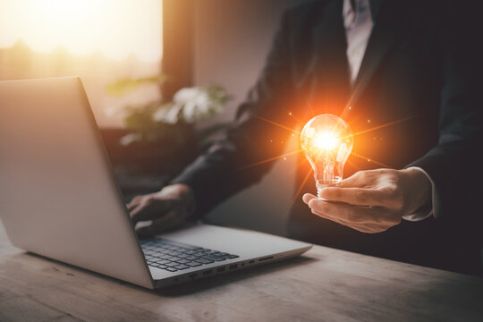 Businessman hand hold virtual lightbulb with laptop (notebook). New ideas inspiration and innovation technology concept. Science and communication concept.