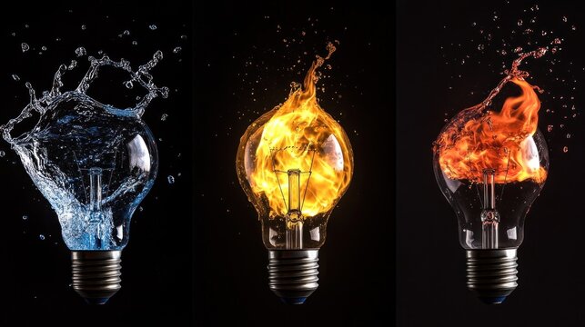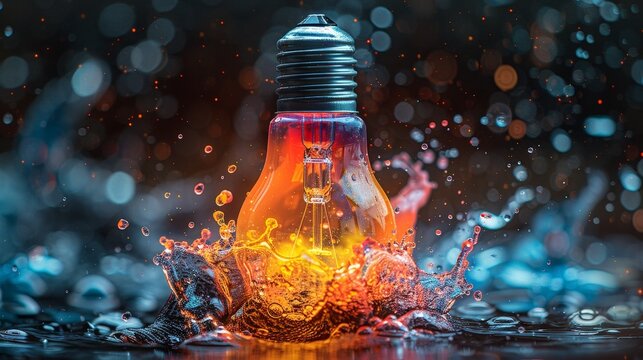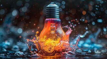 Light Bulb with Colorful Paint Splashes: Red, Blue, Yellow, and Green on a Black Background, High-Speed Photography for Dynamic Patterns and Glowing Effects