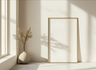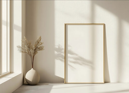 The frame is golden and simple in a poster style with a lightcolored wall and floor