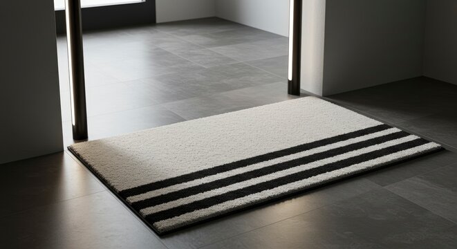 A plush rug with three black stripes lies on a dark tiled floor framed by lightemitting doorway posts