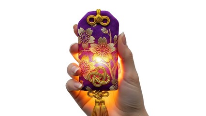 A hand holds a lightemitting purple omamori charm with gold cherry blossom designs and tassel against a white background