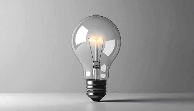 Illuminated incandescent light bulb glows brightly against a muted gray background, showcasing intricate filament detail and emitting warm, golden light, casting a soft shadow below, emphasizing idea
