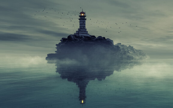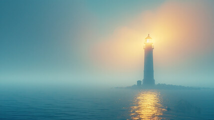 Majestic lighthouse stands in thick fog over calm waters at dawn reflecting its light