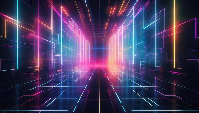 Futuristic corridor with multicolored neon lines. Abstract background and wallpaper.