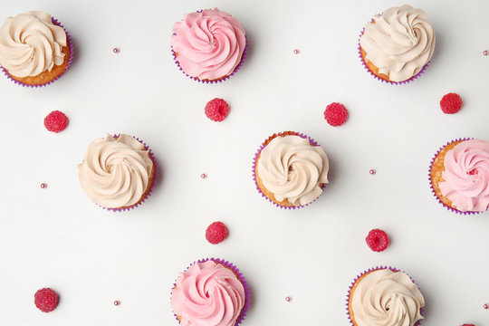 Colorful cupcakes with blue icing and sprinkles on pink surface