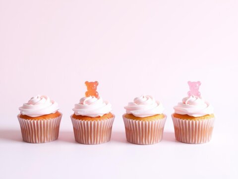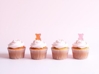 Minimalist row of cupcakes with white and pink frosting and gummy bear toppers on pastel pink background, pink, row, soft lighting