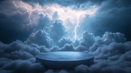 Empty podium set in a stormy environment, with flashes of lightning lighting up the clouds above