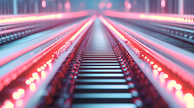 A futuristic perspective of illuminated train tracks, showcasing vibrant red and blue lighting in a sleek, modern environment.