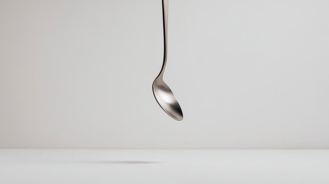 Empty metal spoon floating in the air on a white background, concept of moderation, fasting and lightness