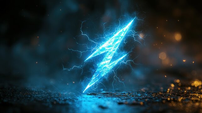 Glowing lightning bolt on dark, smoky ground, sparks background.