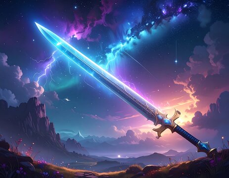 Fantasy sword radiates vibrant blue and red energy. Blade glows with power and speed. Mystical weapon crackles with electric light effects and particles. Abstract digital art for games.