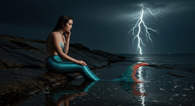 mermaids that are beautiful - A mermaid sits on a rocky shoreline, her shimmering tail glowing under a turbulent sky as lightning bolts illuminate the dark, stormy ocean behind her