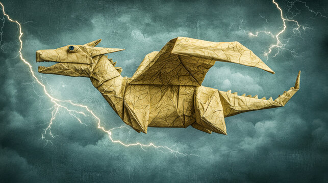 A dragon made of paper, with a blue eye and sharp teeth, is shown in flight against a stormy sky.