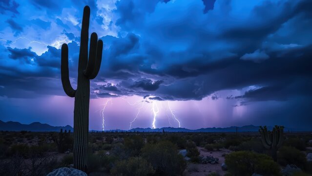 lightning storm landscape silhouette of towering cactus