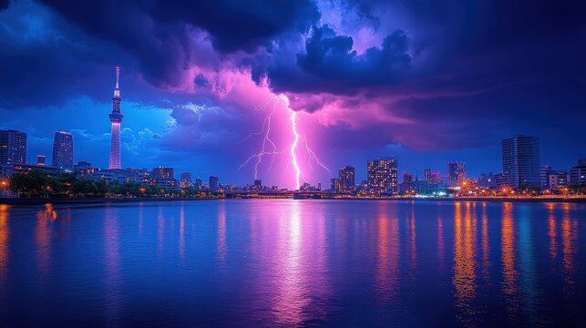 Dramatic thunderstorm with lightning strikes over cityscape at night