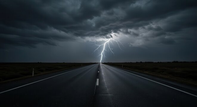 A powerful lightning bolt illuminates a lonely highway stretching into a dark, stormy landscape.