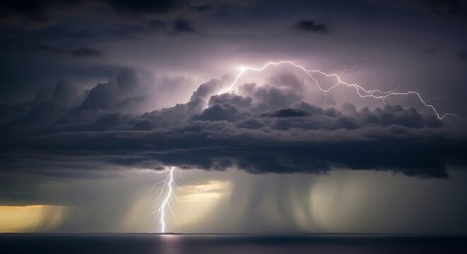 Spectacular thunderstorm with lightning strikes illuminating the dramatic sky above the horizon
