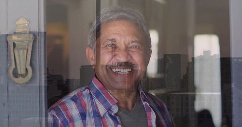 Smiling man standing behind glass, wearing plaid over gray tee, brass knocker and city reflections