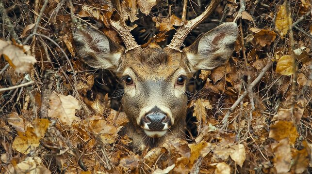 A camouflage-patterned animal like a deer, perfectly blending into the forest landscape, remaining hidden from predators.