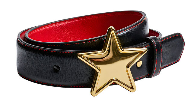 Santa belt with wide black leather strap, oversized gold buckle shaped like a star, and red lining, bold and iconic, isolated on white background