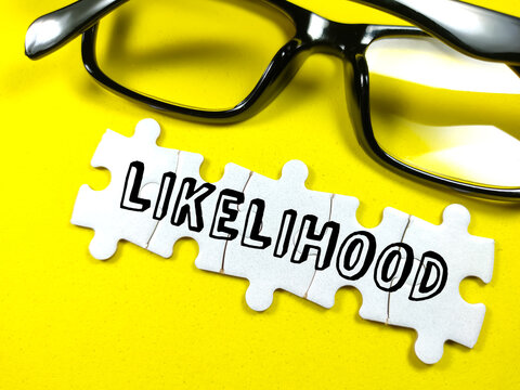 Text LIKELIHOOD on jigsaw puzzle with glasses on a yellow background.