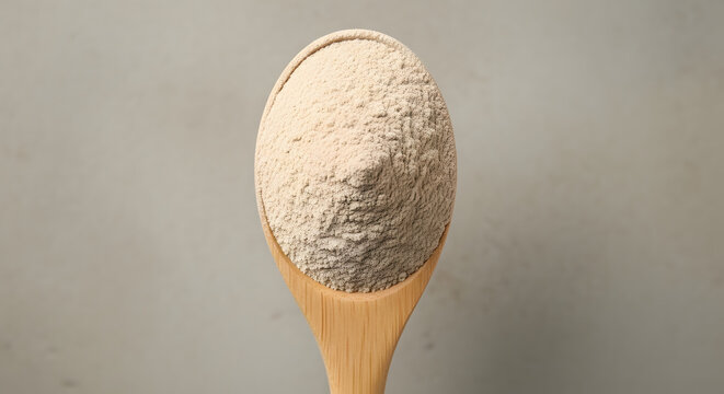 A wooden spoon filled with fine, light brown powder, likely flour or a similar baking ingredient, against a neutral background