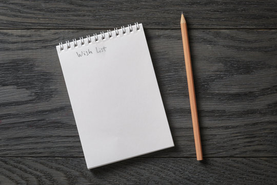 simple blank notepad with phrase wish list on rustic wood table