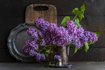 Elegant lilac bouquet in vintage setting with dark backdrop
