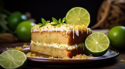 Key lime pie slice with whipped cream, lime wedge, and a fresh, zesty background.