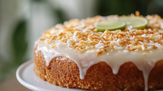 A moist coconut and lime cake with lime glaze and toasted coconut
