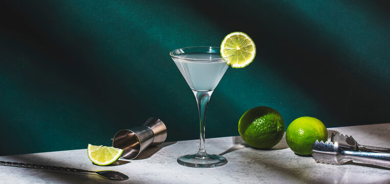 Margarita cocktail lime lemon garnish bright yellow green modern minimal elegant glass refreshing summer drink alcohol bar lounge mixology aesthetic stylish artistic branding advert copy space banner
