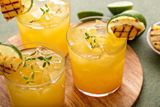Grilled pineapple margarita garnished with lime wedges