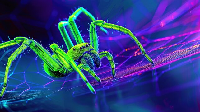 A neon-themed image of a spider in a web, the spider's body depicted in neon green against a stark contrast of deep blue and vibrant purple, enhancing its eerie presence.