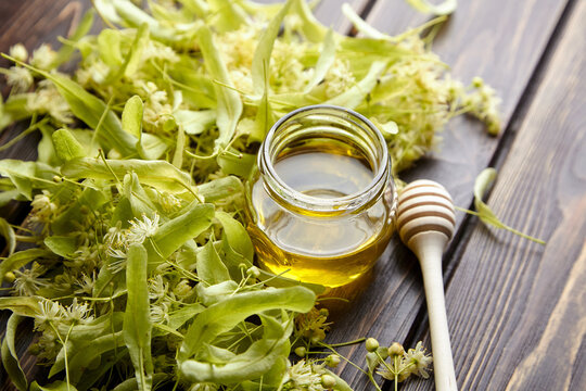 Glass cup of herbal linden tea with fresh green lime tree leaves and yellow blossom. Tasty and healthy drink.